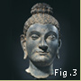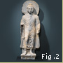 The Mathuran style developed out of the indigenous Indic sculptural tradition. Mathuran sculptures usually have hefty, minimally articulated bodies clothed in transparent fabric and a direct, robust quality (Fig. 1); this is in contrast to the more contemplative and naturalistic images created by Gandharan artists (Fig. 2). The standing Buddha in the Gandharan style has half-closed eyes and a muscular body discernible under the folds of drapery. The Gandharan tradition melded a variety of artistic sources but was dominated by Greco-Roman artistic elements, as demonstrated by the toga-like robe, bent-leg stance, and wavy hair of this figure.