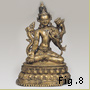 During the Pala period, pilgrims, monks, and students from all over Asia flocked to the prominent religious centers in eastern India, which had greatly expanded since the Gupta period. The brick temples from this time were decorated with steles, carved, for example, with a form of Avalokiteshvara, the Bodhisattva of Compassion (Fig. 7), which were set into wall niches as part of a program of decoration. The graceful posture, clothing, and jewelry of this richly carved image can be seen on other sculptures in this essay from regions such as the Himalayas (Fig. 8) and Shrivijaya (Fig. 9) that had extensive religious and mercantile exchanges with the Pala empire.