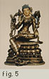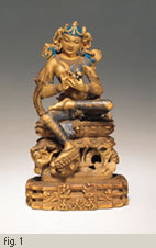 Figure 1, a sculpture of a Buddhist goddess, was acquired by the Asia Society in 1979 and has been described in publications subsequently both as eastern Indian and as Tibetan.1 Finely carved in a beige-colored stone (pyrophyllite),2 the goddess sits upon a lotus, her right leg pendant and the right foot supported by a smaller blossom that emerges from the central lotus stalk. The left leg bends, placing the upturned foot firmly on the right thigh and notably raising the left knee above the lotus support in a posture known as rajalilasana, or “pose of royal ease.” The goddess holds a flower bud while assuming the gesture known as “turning the wheel of the Buddhist law” (dharmachakra pravartana). Two now-broken lotus stalks emerge from the back of the lotus seat, which, when complete, would have blossomed at her shoulders. A precise iconographic identification of the figure is impossible to determine because symbols critical to an exact identification were placed on the now missing lotus blossoms. The most likely identification, however, is that of Mahashri Tara, a popular Buddhist goddess generally associated with compassion, safe travel, and protection from harm and who in this particular form may have been associated with aspirations for wealth.3